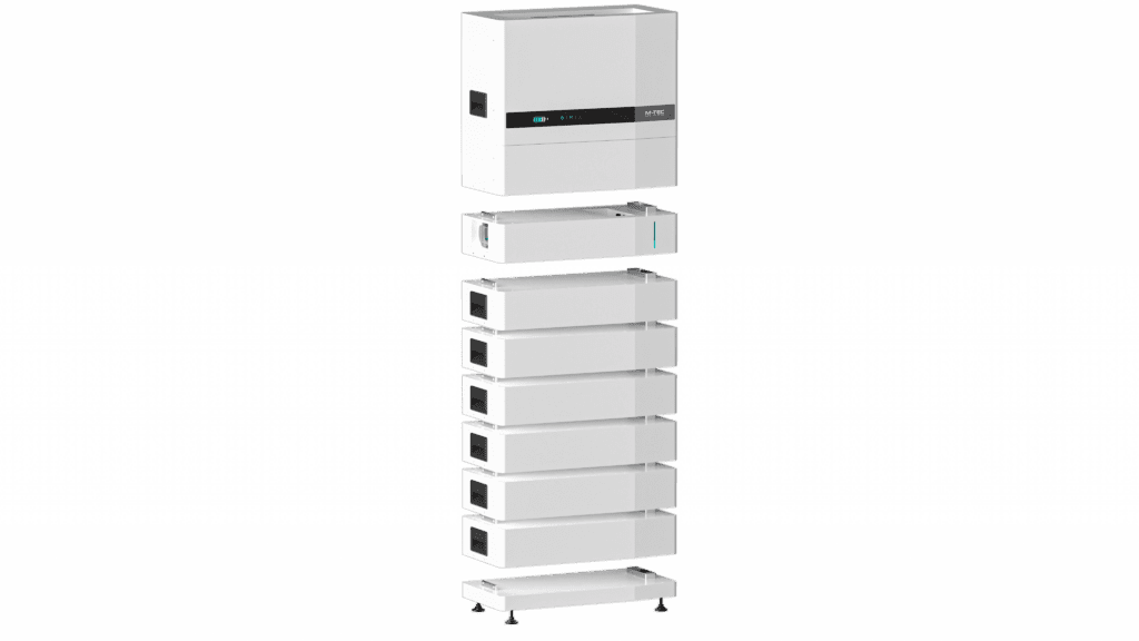 Mit dem Energy-Butler bietet M-TEC eine All-In-One Lösung mit integriertem Hybridwechselrichter in den Größen 6, 8, 10 12, 15 und 20 kW und stapelbaren Modulen von 11,5 kWh bis zu 30,7 kWh. 8 Batteriemodule für bis zu 30,7 kWh (Lithium-Eisen Phosphat / LiFePO4) 10.000 Ladezyklen garantiert innerhalb von 10 Jahren.